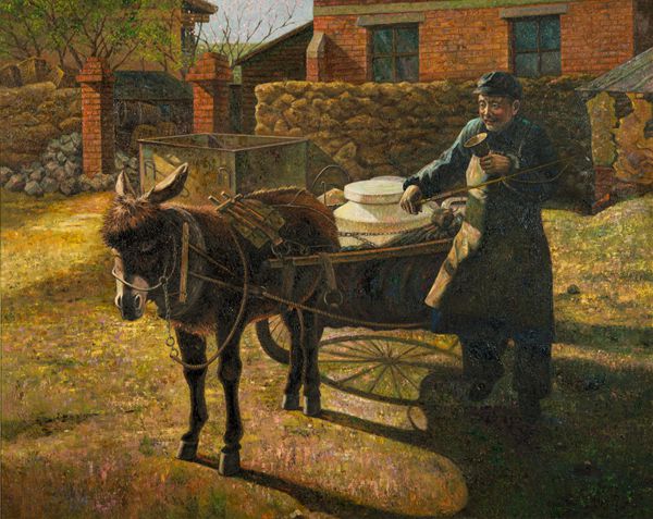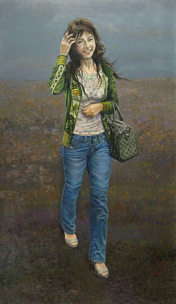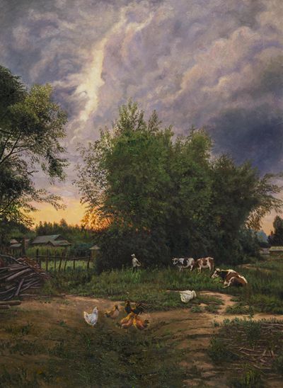 王还霆的油画在充分继承、发挥油画艺术写实传统的同时,在画面中深深地注入了主观性、装饰性、意向性、艺术性。他在表现东北风情时,浓墨重彩地渲染和再现了东北的原野、风雪、民俗、村落、人物,具有鲜明的写实风格。但是他的所有作品中都彰显着画家自己的感觉:有一处沉郁的色调,有一些“去写实”的细节,营造出一种“艺术”的氛围。它们不像一些经典油画逼真程度甚至超越照相,它们也不像印象派、抽象派油画,影像成为附属,彰显的是主观的光、影、色。王还霆的油画既不脱离写实风格,又不纯粹地客观主义,有时甚至刻意具有工艺性、版画风、装饰味。比如,有些细节可以因为工艺性而超过照相的逼真,但主体物象上又刻意疏离逼真。所以,我认为他的油画是具有自己风格、特色、样式的油画,是与前人、别人、他人不一样的油画,也是不可复制、不可重复、不可模仿的油画。他的油画完全是由他自己的人生道路和艺术历程铸造出来的,是特别具有东方意味、东方品质、东方美学、东方技术、东方传统的西式油画作品。在东西方文化融合上,王还霆比前人的眼界更广阔,他在中国、日本、历史、传统、民间等更加广大丰富的背景上展开东方与西方的交融借鉴。这样的探索尽管非常艰难,但毫无疑问具有深远的意义和重要的艺术美学价值。