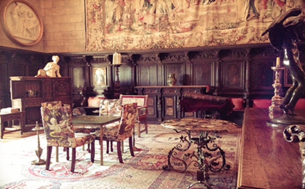 可是整个赫氏古堡只有一间餐厅,客人们不得不按照规定的时间前来用餐。暗淡的银器,天花板上的圣像,画着《但以理书》故事的法兰西壁毯,还有长长的餐桌。他们说的,长长的餐桌,一点实用价值都没有,因为这一头和那一头说话非得借用电话不可。但是美国富人就是爱古代,一切都布置得如同盎格鲁-撒克逊时代某个国王的城堡。