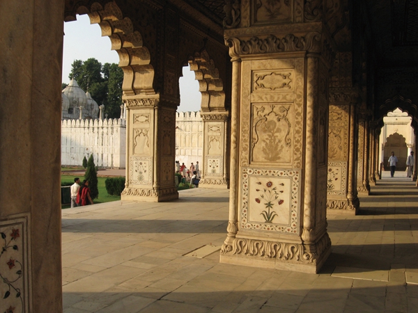 穿过拉合尔门后的甬道,便可看见红堡的外宫——觐见宫。觐见宫由正面9个、两侧各3个拱门依次相连而成,形成了除内墙外三面开放的长方形格局,是沙贾汗王当年亲理朝政和接见百姓之地。现在宫殿内墙中央还矗立着沙贾汗当年坐过的大理石宝座,宝座上精致的花鸟、树木等浮雕,诉说着王国昔日的传奇。