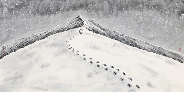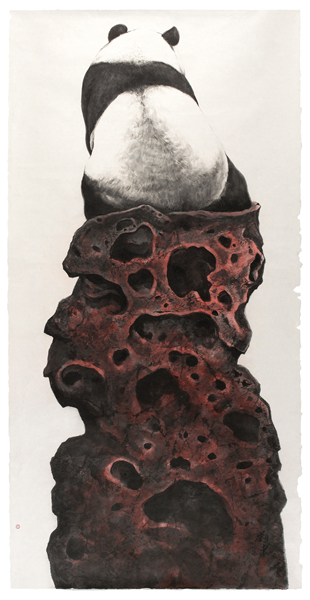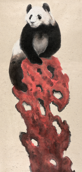 2008年,汶川特大地震后,刘中创作了作品《崛》,一只熊猫攀上红色的石头,双眼坚定地望向远方。刘中把熊猫和寿山石两种典型的中国元素相结合,用传统的水墨语言,以红色代表中国和坚毅,以熊猫代表四川,既展示了中华民族不屈不挠的精神,鼓舞灾区人民重建家园的信心,又预示着崛起的中国在面对挑战时的坚定、自信和对北京奥运会成功举办的必胜信念。刘中为作品命名为《崛》,正是暗含崛起之意。2009年,刘中受邀参加第53届威尼斯双年展,作品《雍》在展览中亮相,一只大熊猫背对着观众坐在一块红色岩石上,微斜着身子,遥望着远方,其憨态可掬的样子,让人忍俊不禁又浮想联翩。为什么熊猫是背对着观众坐的?刘中解释:“因为我觉得背对着观者的熊猫是悠然自得的,不受世人的喧嚣打扰,也就像我们发展中的中国一样,始终以一种平和的心态生存发展。”刘中从一个全新的视角,向世界展现出一个宽容、自信、低调、富强的和谐中国,同时向国际艺坛展示了中国画的风格和魅力。2015年,在北京全力申办第24届冬奥会之季,刘中应邀创作了大幅熊猫作品《瑞雪七宝》,以长城为背景,象征着北京申办冬奥,七只憨态可掬的熊猫在长城雪景的映衬中嬉戏玩耍,象征着冬奥会七大冰雪运动项目。刘中说:“2019年是科学发现大熊猫150周年,我想把熊猫这一主题延续下去,用熊猫这样一个喜闻乐见的‘世界语言’,向全世界讲述美丽动人的中国故事。”