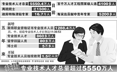 在今年4月2日召开的全国专业技术人才工作座谈会上,人力资源和社会保障部披露,目前全国专业技术人才总量达5550.4万人,过去五年新增专业技术人才860多万人。