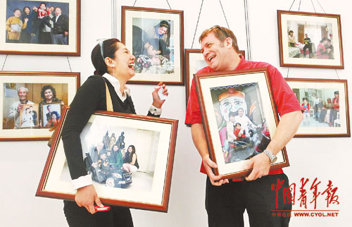 5月14日,“5·15”国际家庭日前夕,来自美国的白云龙(右)正抱着自家的合影照片与同在北京市朝阳区三里屯地区生活的李雨静愉快地交谈,他们两家都是中西合璧的家庭。当天,三里屯街道举办了“美丽三里屯 幸福一家人”图片展,100户家庭都会收到其乐融融的家庭合影照片。本报记者 赵青摄
