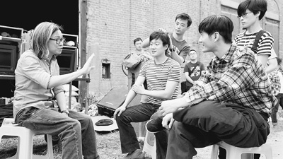 导演陈可辛在《中国合伙人》拍摄现场给演员说戏