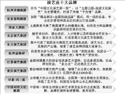 2012年,杭州宋城旅游和北京保利剧院的营业收入均超5亿元,分别排在全国演出机构年营业收入第一名和第二名,而第三名的国家大剧院2012年营业收入为4.2亿元,全国排在前十名的演出机构年营业收入都在1亿元以上,中国演艺巨头正在形成。