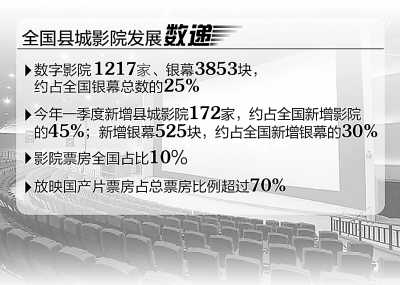在中小城市电影市场增长的背后,是各地电影院建设的快速推进,特别是县城影院为国产电影提供了进一步发展的空间。据国家新闻出版广电总局电影局的统计,截至目前,全国县城数字电影院的银幕总数占到全国银幕总数的25%,其中多厅数字影院约占全国县城数字影院总数的50%。今年一季度,新增县城影院172家,约占全国新增影院的45%;全国新增银幕1744块,其中约三成在县城影院。北京、上海等10个省区市已经基本实现县城数字影院全覆盖。上述数据表明,长期以来中小城市作为电影供给与消费的“夹心层”状况正在扭转。