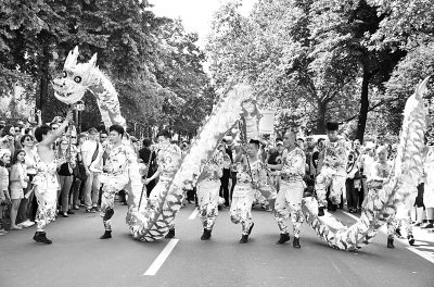 5月19日德国首都柏林举行盛大文化狂欢节,来自世界各国近50个花车方队参加了此次活动。中国金华婺剧团演员表演的舞龙将狂欢节推向高潮。龙身龙体腾跃翻飞,引来阵阵惊呼,激烈、壮观的场面,让观者在不知不觉中也融进了这疯狂的舞龙人潮中,体验到一种从未有过的紧张、惊险和刺激。(光明日报驻柏林记者 柴野摄)