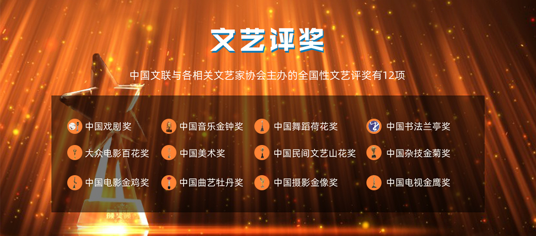 按照中央评奖改革精神和中宣部通知要求,中国文联现有常设全国性文艺评奖12项,分别是:“中国戏剧奖”“中国电影金鸡奖”“大众电影百花奖”“中国音乐金钟奖”“中国美术奖”“中国曲艺牡丹奖”“中国舞蹈荷花奖”“中国民间文艺山花奖”“中国摄影金像奖”“中国书法兰亭奖”“中国杂技金菊奖”“中国电视金鹰奖”,多数既是行业专业奖、专家奖,也是本门类唯一的全国性奖项。其中,“中国美术奖”为五年一届,“中国书法兰亭奖”“中国杂技金菊奖”为三年一届,“中国电影金鸡奖”为一年一届,其它奖项均为两年一届,由各相关全国文艺家协会负责本艺术门类奖项的具体承办,评奖数量合计249个。