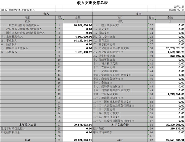 中国文联机关服务中心2022年度收入总计2957.16万元,其中本年收入合计2957.16万元。支出总计2957.16万元,其中本年支出合计2930.08万元,结余分配27.08万元。与2021年度相比,收入增加、支出总计各增加153.36万元,增长5.47%,收入增加主要原因为是收到文联机关拨付养老保险汇算清缴补充款计入其他收入核算。支出的增加主要原因主要是文艺家之家地面塌陷等紧急抢修费用增加。