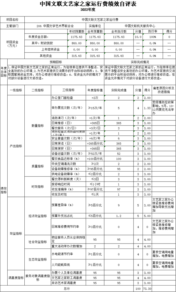 中国文联文艺家之家运行费项目共设一级指标3个,二级指标7个,三级指标28个。完成指标值23个,未完成指标值5个,主要一是受5月、10-12月疫情防控措施影响,全年举办展览次数未能达到预定指标值;二是2022年夏季受天气影响,夏季空调用电增加,能源消耗增加,能源节约率未能达到预定指标;三是由于地面塌陷等紧急抢修项目,导致维修费用节约率及预算差异率未能达到预定指标。