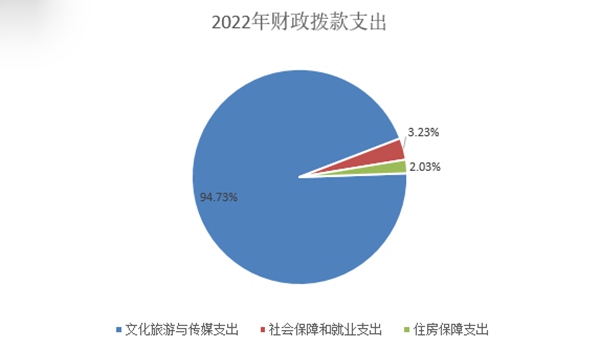 2022年度财政拨款支出主要用于以下方面:文化旅游体育与传媒支出(类)支出949.41万元,占94.73%;社会保障和就业支出(类)32.4万元,占3.23%;住房保障支出(类)20.39万元,占2.03%。