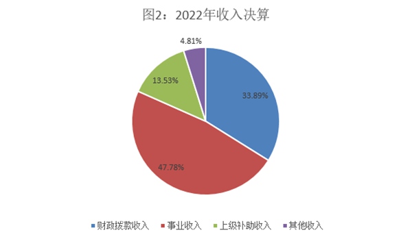 2022年收入合计2957.16万元,其中:财政拨款收入1002.20万元,占33.89%;上级补助收入400万元,占13.53%;事业收入1412.61万元,占47.78%;其他收入142.35万元,占4.80%。