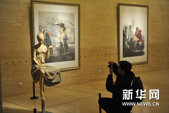 1月15日,一名出席展览新闻会的记者在中国美术馆拍摄一件即将展出的雕塑作品。新华网图片 鲁鹏 摄