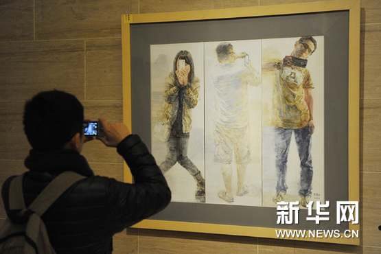 1月15日,一名出席展览新闻会的记者在中国美术馆拍摄一幅即将展出的绘画作品。新华网图片 鲁鹏 摄