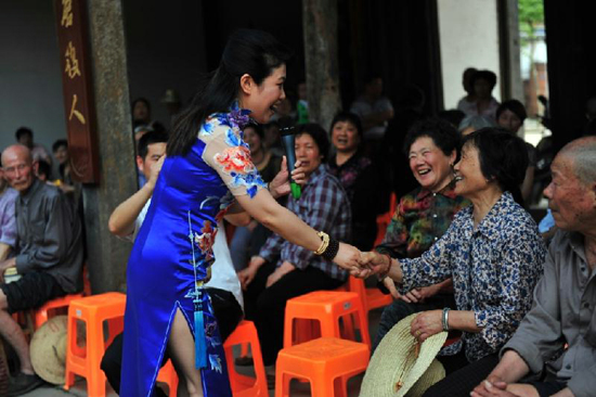随后,音乐、舞蹈、戏曲等艺术家们联手为当地群众送上了一台精彩的文艺演出。深受当地群众喜欢的婺剧表演、变幻莫测的变脸和魔术、惊险刺激的杂技、优美曼妙的舞蹈、令人捧腹的独角戏、欢快喜悦的唢呐和旋律优美的徽胡,让叶店村的群众看得如痴如醉、大呼过瘾。整台演出在浙江歌舞剧院女高音歌唱家、国家一级演员郑培钦《洪湖水浪打浪》和《花儿为什么这样红》的歌声中被推向高潮。
