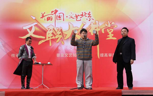4月10日下午,通州区疃里村村委会大院和宋庄镇中心小学又热闹起来,优美的舞蹈、有趣的相声、精彩的魔术和著名儿童作家的阅读写作辅导……北京市文联正在为这里的村民送上精心准备的文化艺术盛宴。除精彩的节目外,“北京文联大讲堂”的艺术家们还讲解了许多艺术知识,北京作协著名儿童作家马光复的“东方少年·中国梦”新创意中小学生作文大赛写作辅导,赢得了村民们和学生们的热烈掌声,掀起了现场一次又一次的高潮。