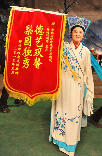 湖北省黄梅戏艺术团团长程丞展示村民赠送的锦旗 张璨龙 摄