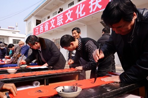 由数位知名书法家组成的文艺志愿服务队,在省书协主席毛国典组织下,现场为村民义务书协春联700余幅,给十里八村的乡亲送去节日的祝福。活动期间,曹杭副主席还带领省文联扶贫组走访慰问了困难群众、基层老党员,并赠送慰问金。