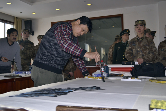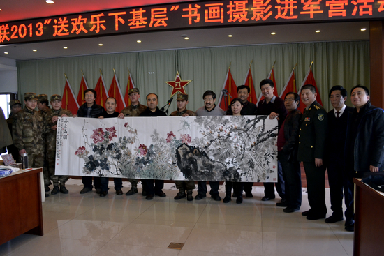 由省美协王学辉、孙海青、郝向炫、刘彩军、任晓军、乔亚丁、徐晋平、董志敏、李桂平、高雪涛共同创作了一幅精品——“春色满园”百花迎春图把现场气氛推向了高潮。牡丹花的雍容与富贵、娇艳和大气,玉兰花在一片绿意盎然中开出大轮的白色花朵,令人感受到一股难以言喻的气质,委实清新可人,这幅花鸟韵味的国画春情洋溢,给官兵们带来了春天般的希望。