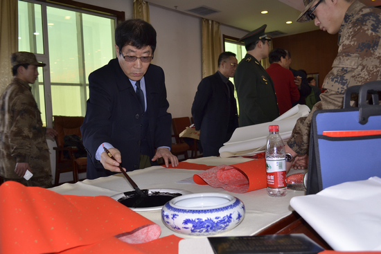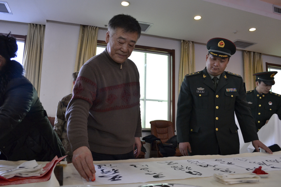 简短的仪式结束后,由省文联主席、省书协名誉主席李才旺同志为活动开笔,那饱含真情、苍劲刚健的“鱼水情深”,拉近了官兵们和艺术家们的距离,表达了艺术家们对广大官兵的崇敬之情。书画家们随即投入了紧张的创作中,此时,几乎每位艺术家的案桌前都被官兵们“团团围住”,有些甚至排起了长队。官兵们自选对联内容,然后由艺术家题写。“福星高照全家福、春光耀辉满堂春”、“小康家庭欢乐日、春回大地艳阳天”……一副副对联寄托着广大官兵美好的愿望,也凝聚着艺术家们对战士们的浓浓情意。