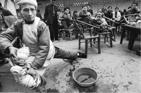 多年前回灌县(今四川省的都江堰市)老家,跟随素有坐茶铺瘾癖的幺外公喝过一次早茶。雄鸡刚一打鸣,幺外公便唤醒了酣睡中的我,来到距家仅百米开外的一座临街茶铺。天色尚黑,街灯昏黄,行人稀疏,但茶铺里却已是沸沸扬扬——喊堂的,问早的,茶船茶盖稀里哗啦的,浑然一片,仿佛全城人一天的生活从这里热热闹闹开始了。茶客之间一阵例行的寒暄之后,幺外公拣了“亘古不变”属于自己的椅子坐下来(老茶客都有了固定的座位),泡上盖碗茶,在东方既白的清晨,他那一动不动的身影就像是一尊朦胧的雕像。幺外公向来少言寡语,常常会这样静静地、心如止水般,在茶铺里坐上一整天,有时甚至连饭都忘记回家吃。此刻,从他沉迷的眼神中,我分明感觉到平日间少有显现、只有坐茶铺才流露无遗的对现实人生极大的满足。这次喝早茶的经历让我对茶铺产生了浓厚的兴趣,长时间地估摸着:是什么原因让幺外公如此迷恋茶铺?从那以后,茶馆里的那种特有的氛围也随着茶香在我心中氤氲,我也有了幺外公般的迷恋,茶馆和茶客们的百态也成了我镜头中的一个主题。