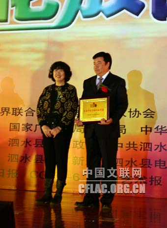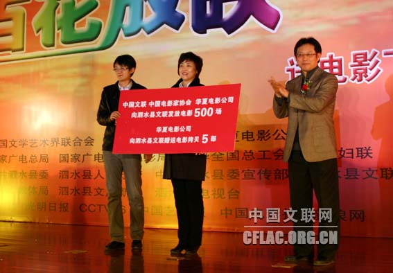 中国影协分党组成员、副秘书长柳秀文代表中国影协授予泗水县“百县千村万场放映单位”的牌匾。中国文联网 李亮 摄