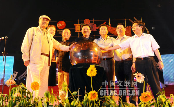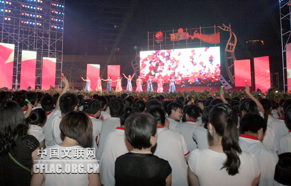 5月27日晚,为庆祝中国共产党成立90周年,由中国文联、中国影协、重庆市委宣传部主办,国家广电总局、全国总工会、全国妇联支持,中国影协百花放映办公室、重庆市文联、璧山县委县政府承办的“百花放映·红色之旅”大型电影惠民活动重庆市璧山县体育中心开幕。中国文联副主席丁荫楠,中国影协分党组书记、驻会副主席康健民,中国曲协副主席、中国文学艺术基金会秘书长姜昆,中国影协党组副书记、秘书长许柏林,分党组成员、副秘书长柳秀文,璧山县委书记范明文等领导出席开幕式。图为开幕式现场。中国文联网 董大汗 摄