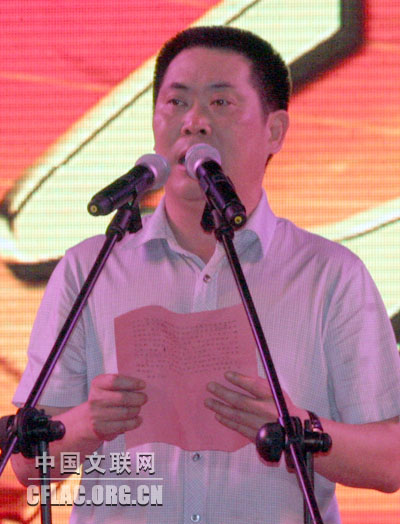 5月27日晚,“百花放映·红色之旅”大型电影惠民活动重庆市璧山县体育中心开幕。图为璧山县委书记范明文致辞。中国文联网 董大汗 摄