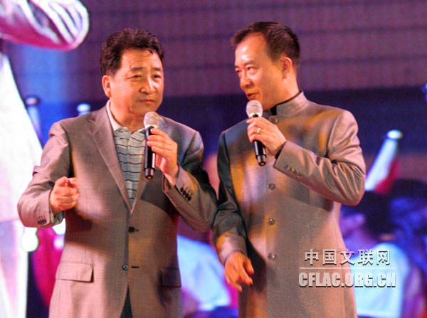 5月27日晚,“百花放映·红色之旅”大型电影惠民活动重庆市璧山县体育中心开幕。图为著名相声表演艺术家姜昆、戴志诚表演相声《欢歌笑语》。中国文联网 董大汗 摄