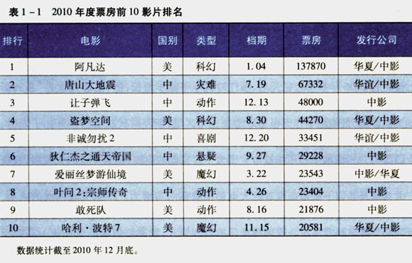 票房排名前10位的影片中,国产片和进口片各占半壁江山,平分秋色。前10位影片票房总和接近年内总票房的一半,反映出影片赢利能力极其不均衡的客观事实。2010年,进入排行榜前10位的影片,票房均达到了2亿元以上,比2009年度排行中第10位的影片《冰河时代3》(1.61亿元票房),排行门槛大大提高。