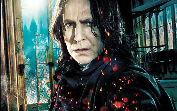 当我们在谈论《哈利·波特》的时候,眼角的余光总是会瞥见不远处那个黑色的身影。那个好像从来没有洗过头的黑发巫师,那个总是喜欢跟哈利对着干的魔法教授,那个亦正亦邪乖张到有些任性的大叔。斯内普,他的名字就像洛丽塔那样动人,而他的所作所为在观众心中也像亨伯特眼中的洛丽塔一样难以捉摸。在后面的几部《哈利·波特》中,我们越来越觉得他是一个举足轻重的人物,但是罗琳却将他的秘密保留到了最后。隔着一层木板,那场看不见的杀戮却是那么的让人揪心。杀手离开、斯内普一世的爱恨情仇化作一滴眼泪,在融化进冥想盆中的那一刻,再无任何顾忌地满溢出来。从两小无猜到被现实分开再到亲眼看到最爱的人的尸体,斯内普对莉莉的爱情是那么的美丽而又无力,只能远远地看着,远远地守护,远远地落寞和悲伤。而哈利的出现,让他重新看到了只有莉莉才拥有的那双美丽的绿色眼睛。他对哈利的态度越复杂,就证明了他对莉莉的爱越深。当我们谈论《哈利·波特》时,我们在谈论斯内普,我们在谈论爱情,那些遥不可及的、最美丽而又最伤感的心动和思念。