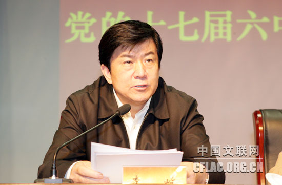 10月19日,中国文联召开大会,传达贯彻党的十七届六中全会精神。图为中国文联党组副书记、副主席李屹传达中央领导同志在十七届六中全会上的重要讲话精神。中国文联网 孟祥宁 摄