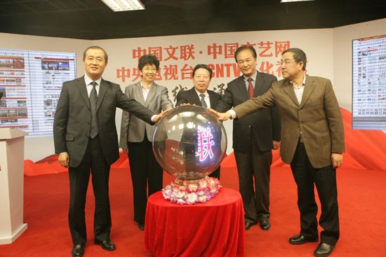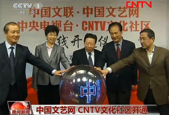 为贯彻落实党的十七届六中全会精神,发展健康向上的网络文化,推动社会主义文化大发展大繁荣,建设社会主义文化强国,中国文联和中央电视台携手共建中国文化全媒体传播平台,合力推动社会主义文化大发展大繁荣。11月14日,由中国文联主管主办、本报承建的中国文艺网和中央电视台主办、中国网络电视台创建的CNTV(中国网络电视台)文化社区上线开通仪式在京举行。