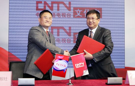 11月14日,中国文艺网和CNTV文化社区开通仪式在京举行。图为中国艺术报社和中国网络电视台在上线开通仪式现场签署战略合作协议。中国文艺网 孟祥宁 摄