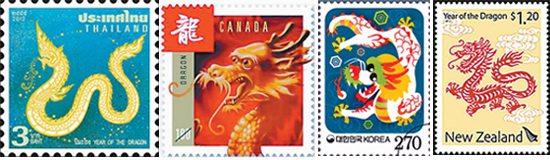 上图从左至右依次为:泰国龙年邮票、加拿大龙年邮票、韩国龙年邮票、新西兰龙年邮票