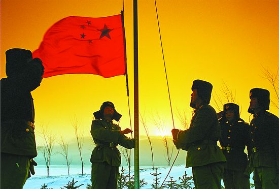 就是在这样的环境中,战友们在哨所前竖起了一根旗杆,无论风雨弥漫,还是大雨磅礴,每当朝阳升起的时候,全哨所有的战友全部在这里举行升国旗的仪式,并唱着那首豪迈的歌《我把太阳迎进祖国》。我被战友们趴冰卧雪、站岗巡逻、以苦为乐的奉献精神感染着,镜头一直聚焦在这里。进入新世纪,解放军画报社组织“跨世纪的中国周边行”大型摄影报道活动,我第四次来到这里,记录下军民合力,兴边固防,哨所环境改变的情景。“东方第一哨”有了可视电话,哨兵们喝上了井水,各种环境都得到了改善。