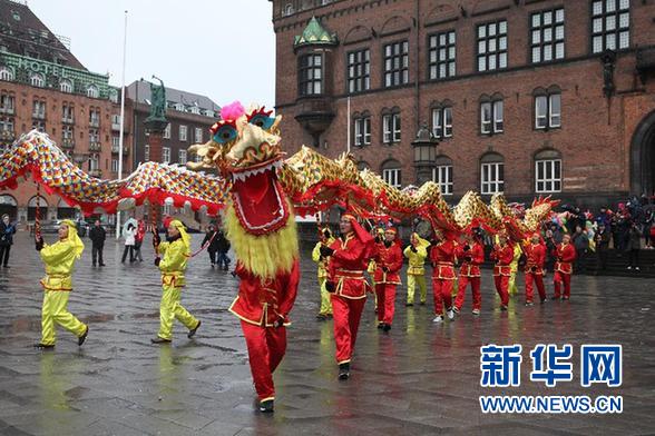 1月22日,华人华侨在丹麦哥本哈根市政厅广场上欢舞祥龙,庆祝春节。当日,旅丹华侨华人在哥本哈根举行庆祝活动,并在市中心的蒂沃利乐园举行春节联欢晚会。丹麦首相托宁-施密特向晚会发来贺信,给旅丹华人和中国人民拜年。新华社发(吴波 摄)