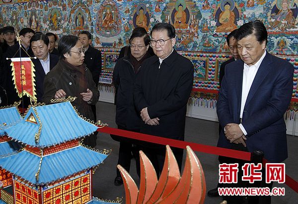 2月14日,中共中央政治局常委李长春来到北京全国农业展览馆新馆,参观中国非物质文化遗产生产性保护成果大展。新华社记者 庞兴雷 摄