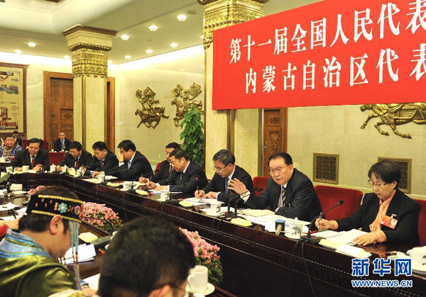 3月7日,中共中央政治局常委李长春参加十一届全国人大五次会议内蒙古代表团的审议。 新华社记者 饶爱民 摄