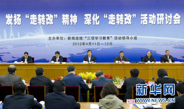 新华网北京4月11日电 新闻战线“三项学习教育”活动领导小组11日在京召开发扬“走转改”精神、深化“走转改”活动研讨会。中共中央政治局委员、中央书记处书记、中宣部部长刘云山出席会议并讲话,强调“走基层、转作风、改文风”活动是对党的新闻工作优良传统的继承发扬,是新形势下改进新闻宣传工作的创新举措。新闻战线要深入总结“走转改”的成功经验,推动“走转改”活动常态化,引导广大新闻工作者带着紧迫感自觉“走转改”,带着责任感坚持“走转改”,带着使命感深化“走转改”,以优异成绩迎接党的十八大胜利召开。
