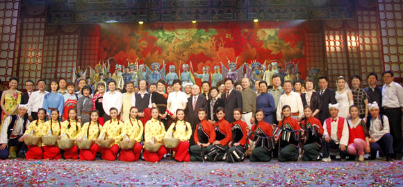 5月8日,由中国文联、中国剧协、中国音协、中国舞协、中共陕西省委宣传部、陕西省文联、中共延安市委、市政府共同举办的纪念“5·23”讲话发表70周年系列活动在延安启动。8日晚,由中国文联、中国剧协等单位精心组织的第一场大型演出“中国戏剧家延安行”文艺晚会在延安解放剧院举行。图为观看演出的领导和嘉宾与演员合影。中国艺术报 彭宽 摄