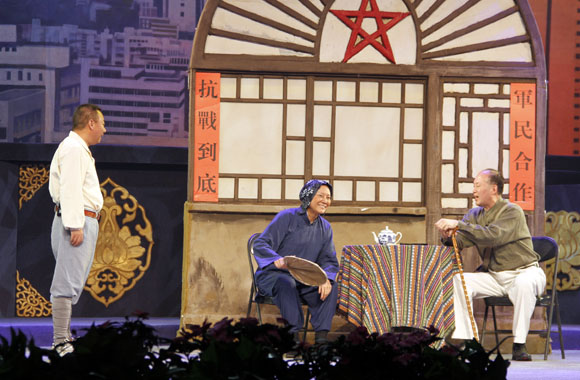 5月8日晚,由中国文联、中国剧协等单位精心组织的第一场大型演出“中国戏剧家延安行”文艺晚会在延安解放剧院举行。图为郭达、王丽云、邵峰表演戏剧小品《红色珍宝》。中国艺术报 彭宽 摄