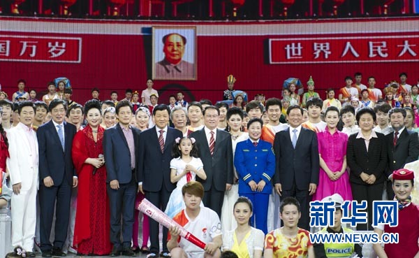 5月16日,中共中央政治局常委李长春来到北京国家体育馆,与近3000名首都群众一起观看大型情景音舞诗画《天安门》。这是演出结束后,李长春等与部分演职人员合影。新华社记者 谢环驰 摄