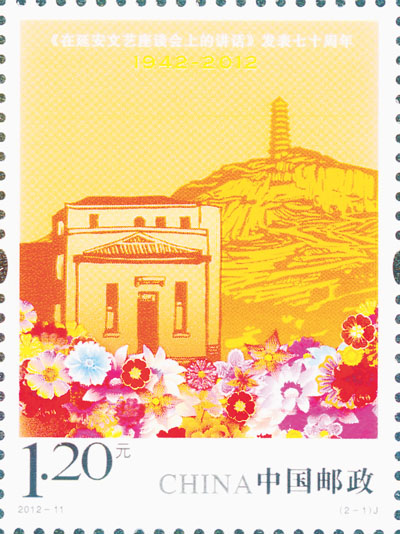 由中国邮政发行的《〈在延安文艺座谈会上的讲话〉发表70周年》纪念邮票今天面世。在中国文联、中国美协协助下,中国邮政邀请邮票设计专家几易其稿,最终设计图稿层次分明、颜色通透;印制采用影写版,并使用了异形齿孔、防伪油墨、防伪纸张、荧光喷码等防伪技术,具有较高的观赏和收藏价值。
