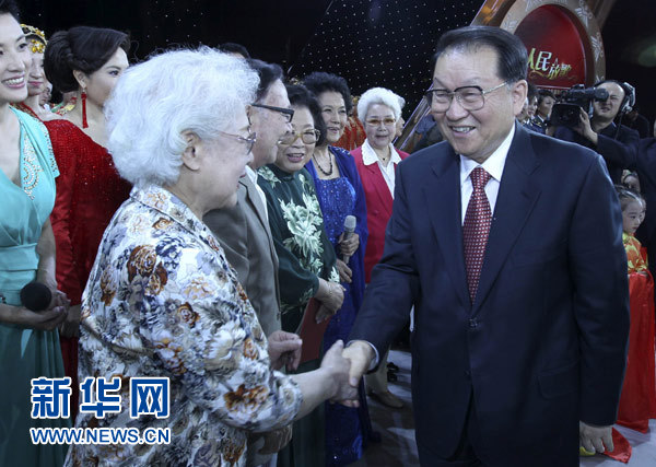 5月23日晚,“为人民放歌——纪念毛泽东同志《在延安文艺座谈会上的讲话》发表70周年大型文艺晚会”在北京举行,中共中央政治局常委李长春出席观看。这是演出结束后,李长春上台祝贺演出成功。 新华社记者 庞兴雷 摄