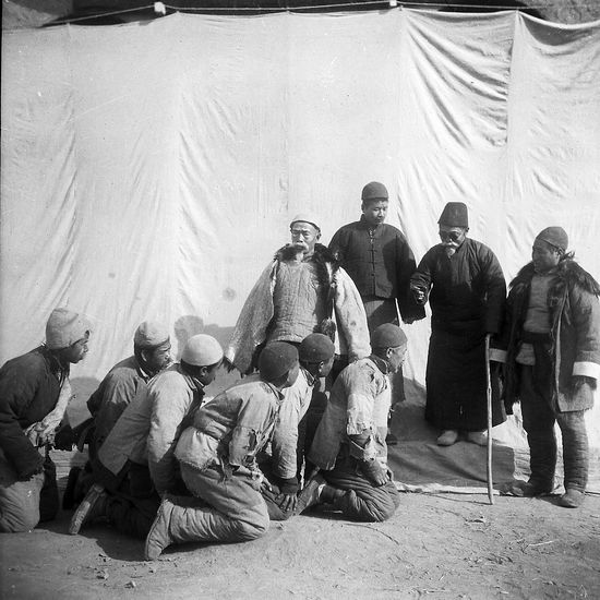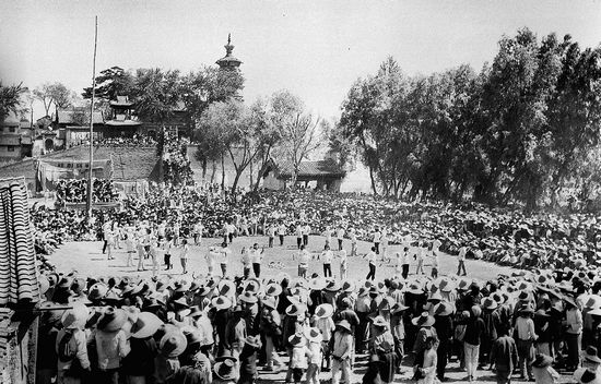晋察冀边区第二届县议会民主选举活动中,诗人邵子南在阜平城南关说大鼓 1943年 李途 摄