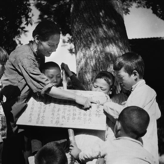 劳动英雄韩凤龄带小学生读《拥军公约》 1944年 白连生 摄