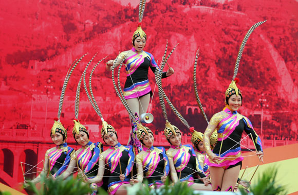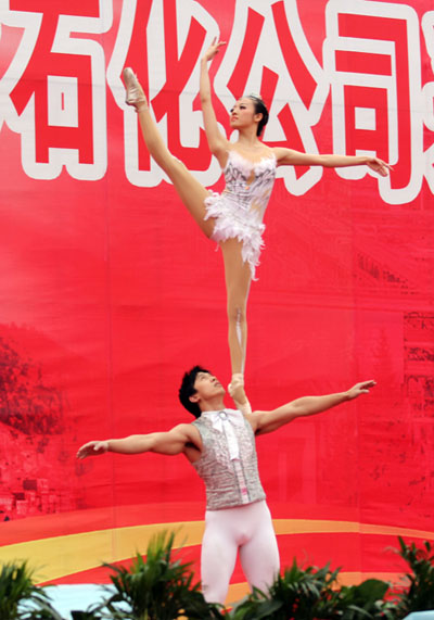 万余名观众的演出现场座无虚席。吉化公司数十名劳动模范、金牌工人坐在前排,演出会场红旗招展,“中国石油感谢党中央、国务院亲切关怀”、“中国石油吉化向全国人民致敬”、“迎接党的十八大,创建和谐吉林”的标牌在观众席中格外醒目。著名相声演员牛群和央视著名节目主持人朱军、鞠萍、刘芳菲组成的嘉宾主持队伍一登场就受到现场观众热烈欢迎。杂技、魔术表演是此次演出一大亮点。在偌大的体育场上空,观众早早地就看到了一个起重机的大吊臂悬在上边,原来,这是杂技《空中彩绸》的道具,来自济南杂技团的吴长征、孔倩倩为吉林的观众带来了一场优美的高空“舞蹈”;而另一个精彩“舞蹈”是广州军区政治部战士杂技团陈东、于婉青为大家带来的《东方的天鹅——芭蕾对手顶》。远道而来的四川省遂宁市杂技团牟强、杨刚给观众带来的是《比翼——双人倒立技巧》,堪称力量和顽强精神的完美展现;魔术师李彦培表演魔术《变脸》,随着一张张不同色彩、花样的脸谱瞬间替换,台下观众连连叫好;《俏花旦——空竹》是中国杂技团的代表性节目,是京剧造型与空竹技巧的完美结合。杂技绝活让观众惊叹,名家大腕相继登台亮相则将演出氛围推向高潮。一听到那豪迈而洪亮的女声评书,很多人已经猜到,这就是中国文联副主席、著名评书表演艺术家刘兰芳,她为大家带来了一段诙谐幽默的《张飞请诸葛》;冯巩、李志强特意为吉化的观众量身定做了一段《吉化您好》,一下子拉近了与观众的距离;72岁的著名男高音歌唱家吴雁泽一曲《草原上升起不落的太阳》,嘹亮的歌声直透云霄。著名电影演员郭碧川的诗朗诵《崇敬——献给英雄的吉化人》,著名京剧演员于兰的京剧《杜鹃山》选段《家住安源》,中国广播民族乐团名誉首席、著名胡琴演奏家姜克美的京胡独奏《夜深沉》,中国石油吉化公司职工乔晓鸥带来的《化工城之夜》,著名歌唱家范竞马、郑咏演唱的《走向复兴》等节目都是精彩纷呈。