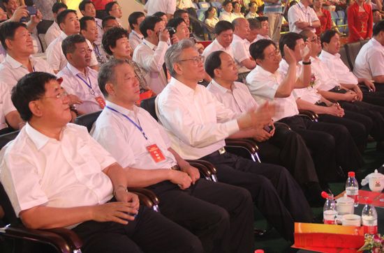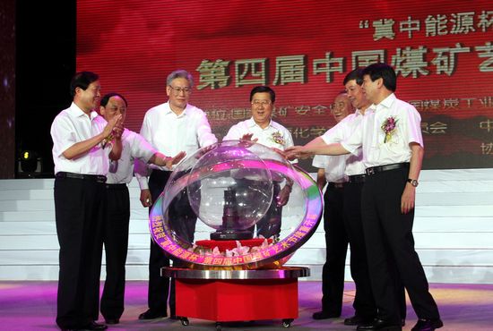 王显政、夏潮、李世明、梁嘉琨、张和、王社平共同按动第四届煤矿艺术节启动球
