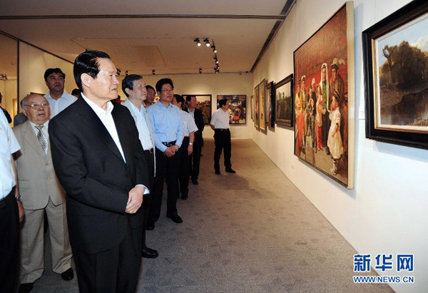 新华网北京5月29日电(记者杨维汉、崔清新)中共中央政治局常委、中央政法委书记周永康29日在北京参观正在举办的“情系神州-新疆油画全国行”展览。