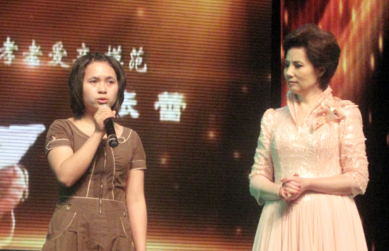 5月22日,“全国道德模范故事汇”基层巡演2012福建福州专场中,第三届全国孝老爱亲道德模范张蕾接受主持人采访。刘红英 摄